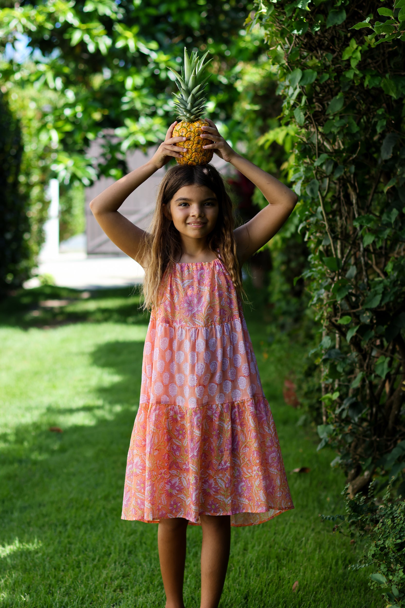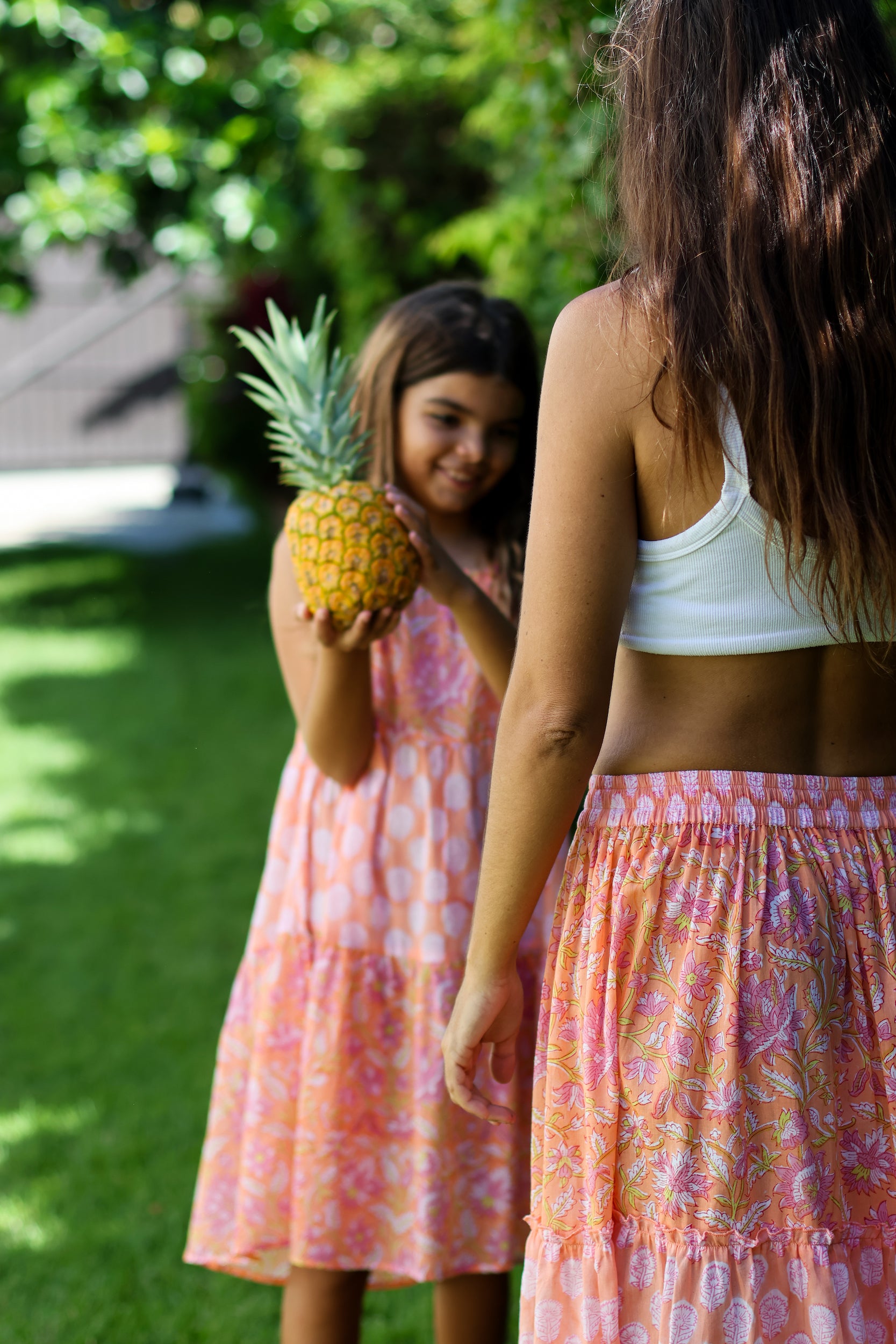 Sweet, playful, and made to match with Mama—our Guava Girls Dress is a charming mini version of your favorite styles. Hand block printed with love, this dress features alternating tiers for a twirl-worthy silhouette and an adjustable neckline with a tie on the shoulder for the perfect fit. It pairs beautifully with multiple pieces from our women’s collection, so you and your mini can match in style.