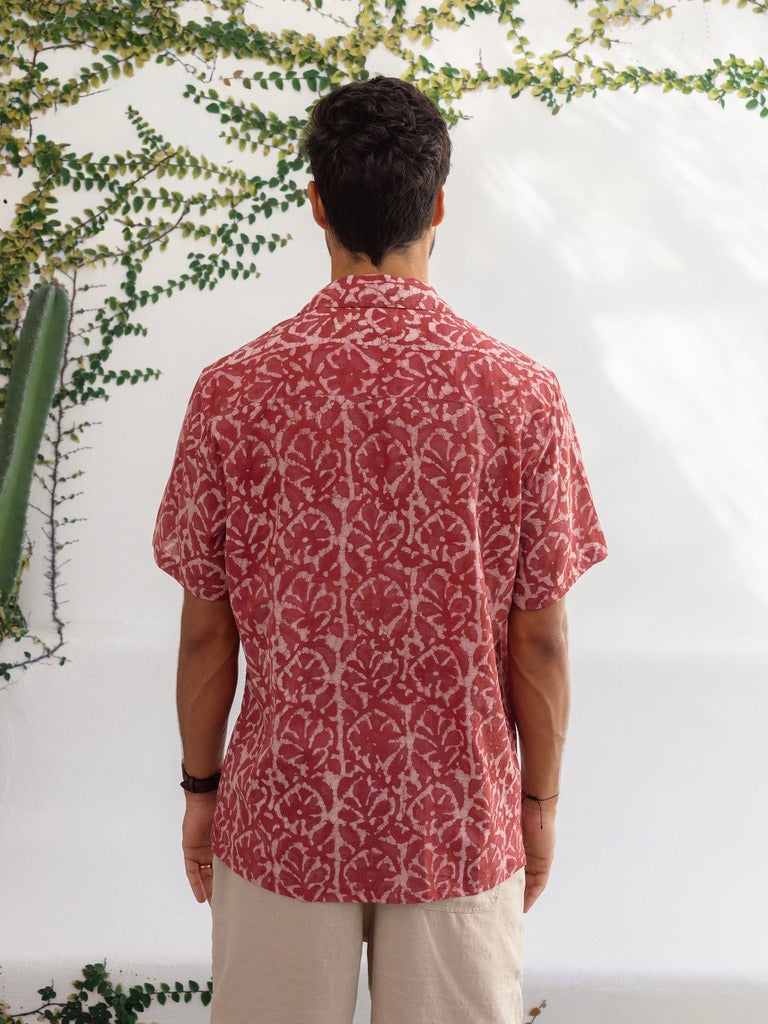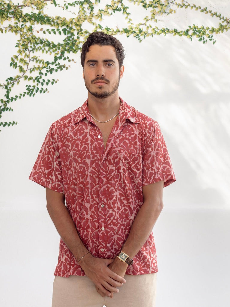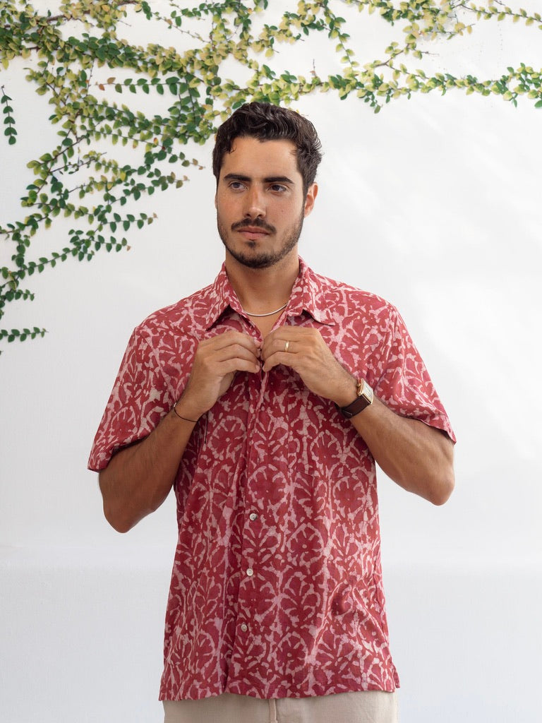 Light, breathable, and effortlessly cool, this short sleeve button-down is your go-to for warm weather. Each shirt is hand block printed in Jaipur, India. A process where wooden blocks are carved by hand, pressed into natural dyes and stamped by hand onto the fabric.