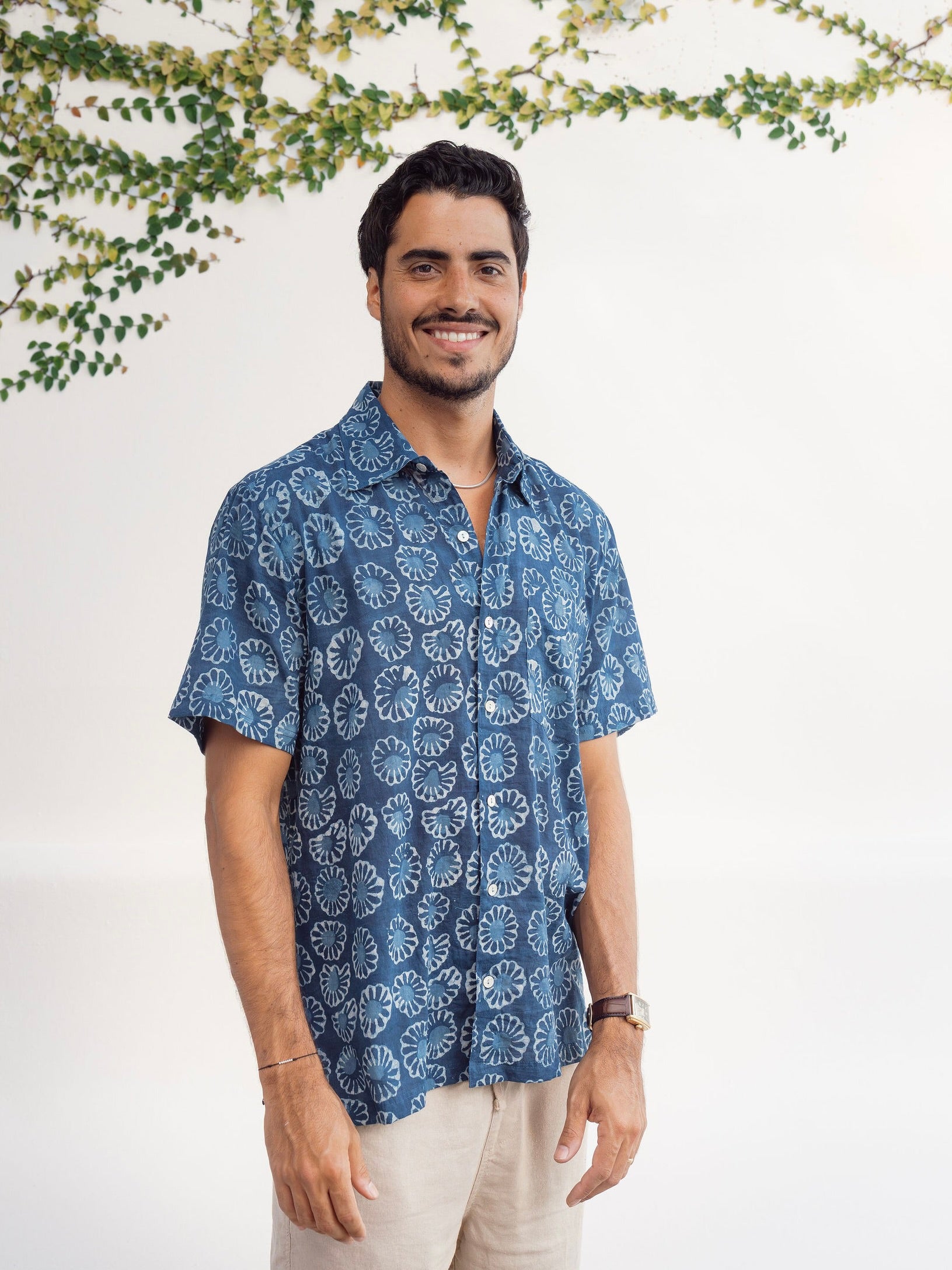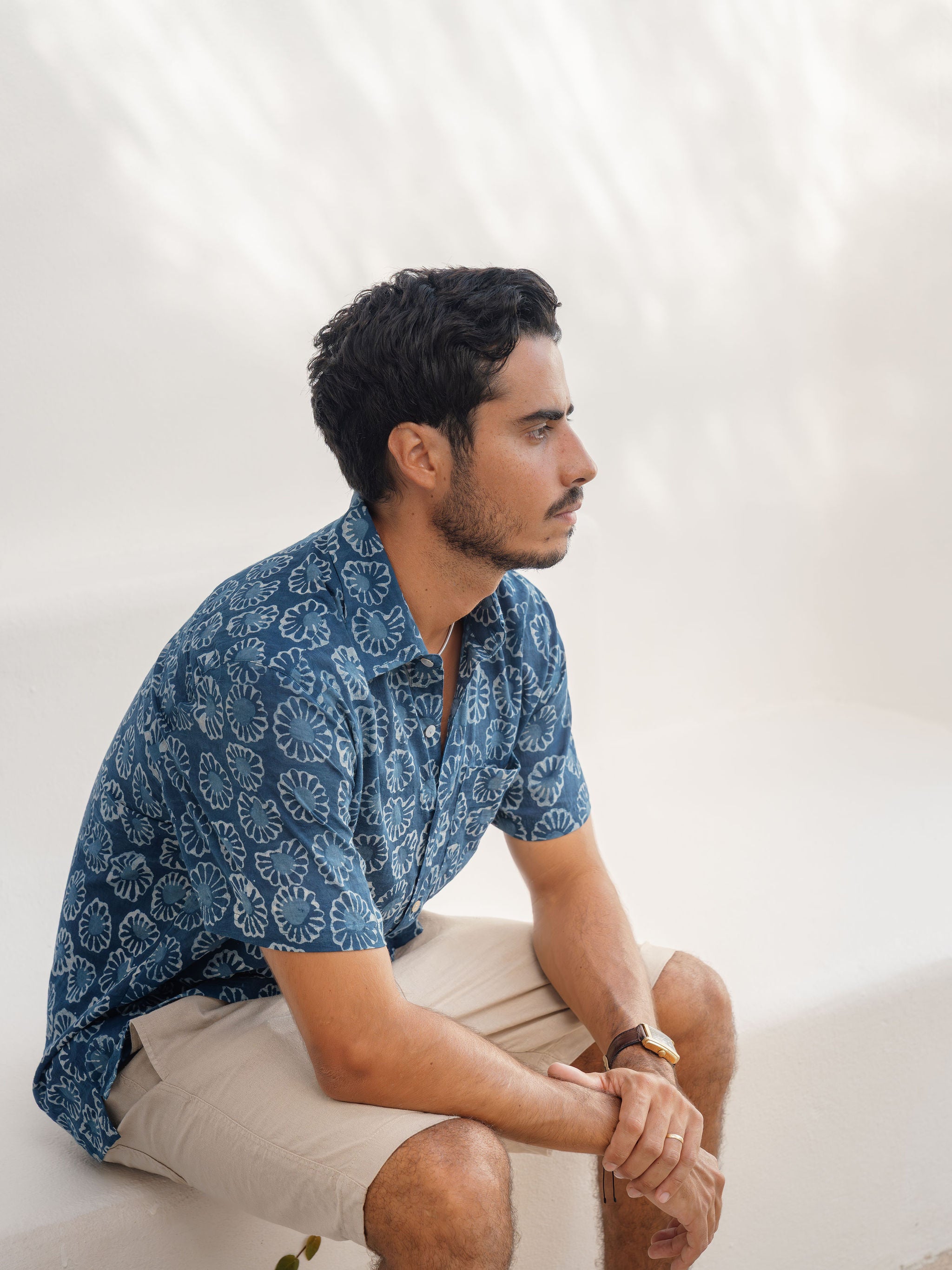 Light, breathable, and effortlessly cool, this short sleeve button-down is your go-to for warm weather. Each shirt is hand block printed in Jaipur, India. A process where wooden blocks are carved by hand, pressed into natural dyes and stamped by hand onto the fabric.