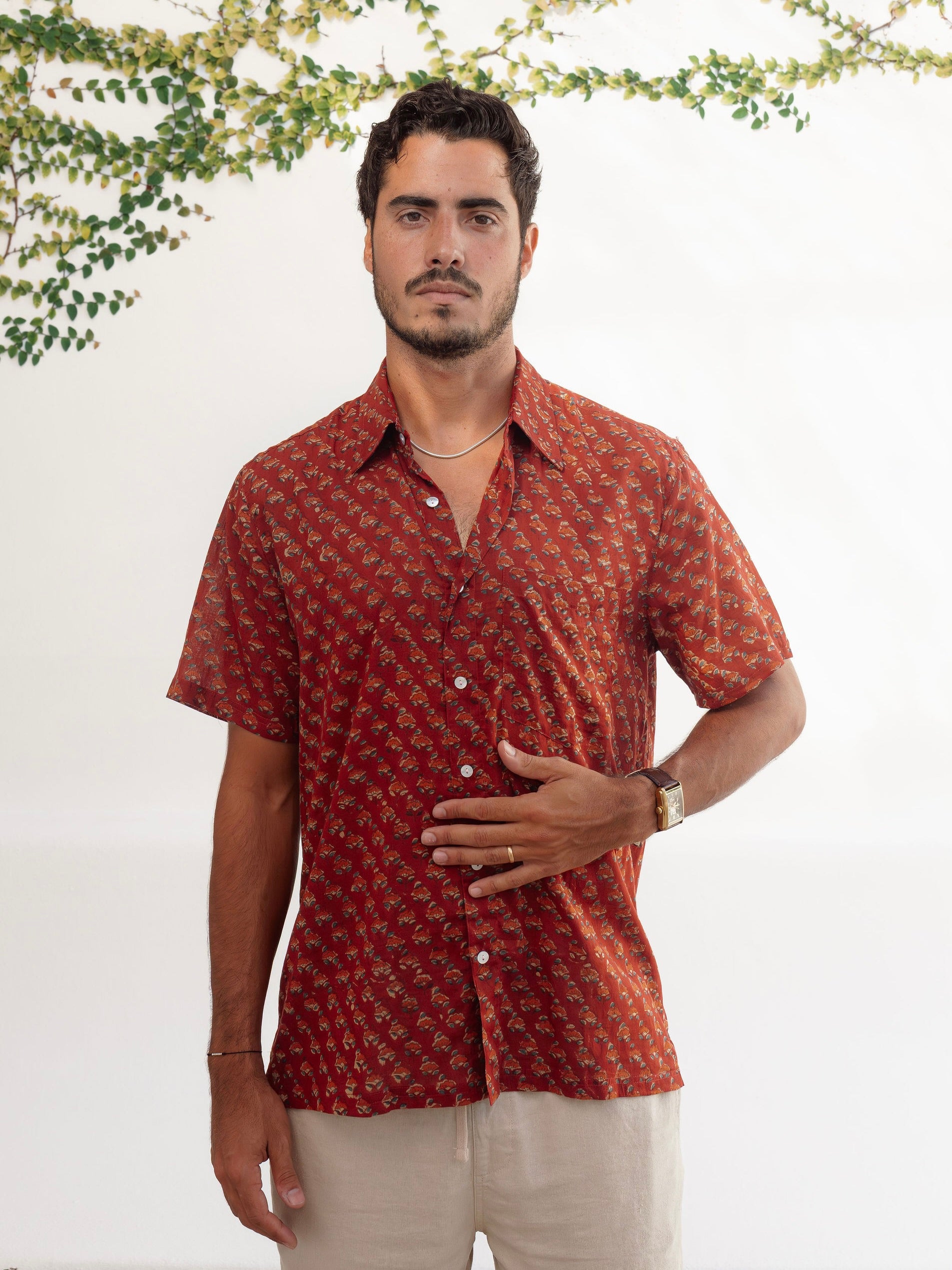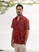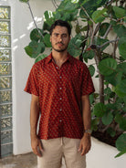 Light, breathable, and effortlessly cool, this short sleeve button-down is your go-to for warm weather. Each shirt is hand block printed in Jaipur, India. A process where wooden blocks are carved by hand, pressed into natural dyes and stamped by hand onto the fabric.