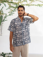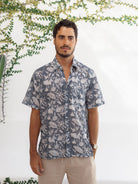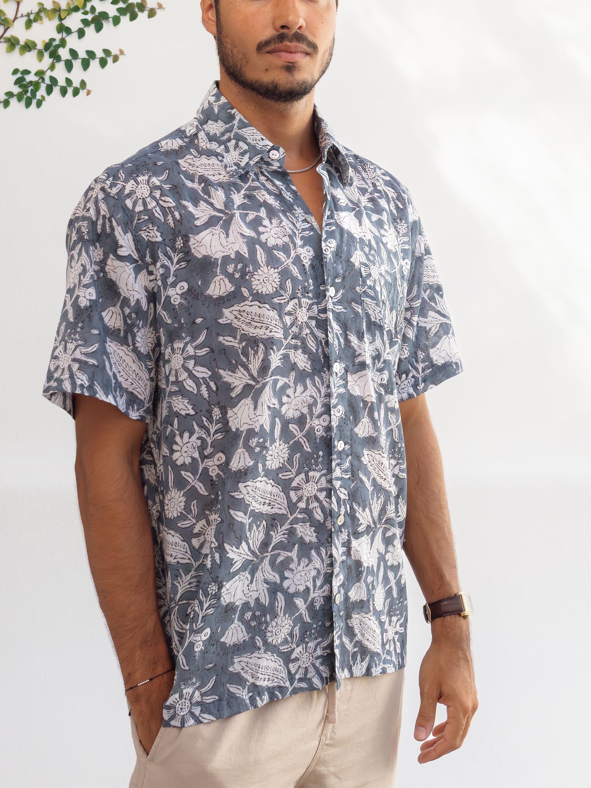 Light, breathable, and effortlessly cool, this short sleeve button-down is your go-to for warm weather. Each shirt is hand block printed in Jaipur, India. A process where wooden blocks are carved by hand, pressed into natural dyes and stamped by hand onto the fabric.