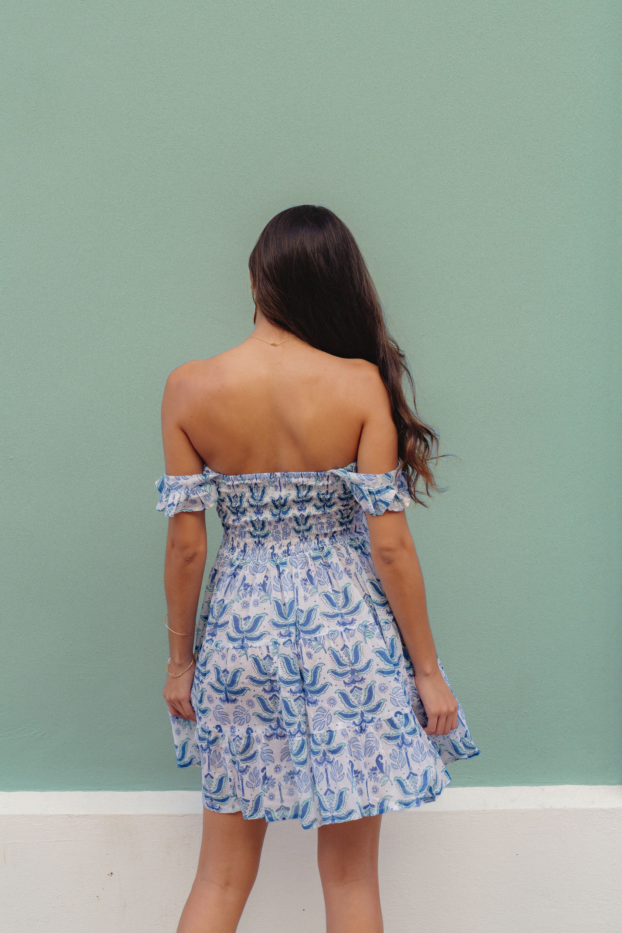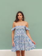 The flirty mini-length silhouette features a flattering smocked bodice that offers both comfort and structure, while ruffle-trimmed straps add a soft, romantic finish. Easy to wear and endlessly versatile, it's perfect for sunlit strolls, weekend getaways, or casual days with a touch of charm.