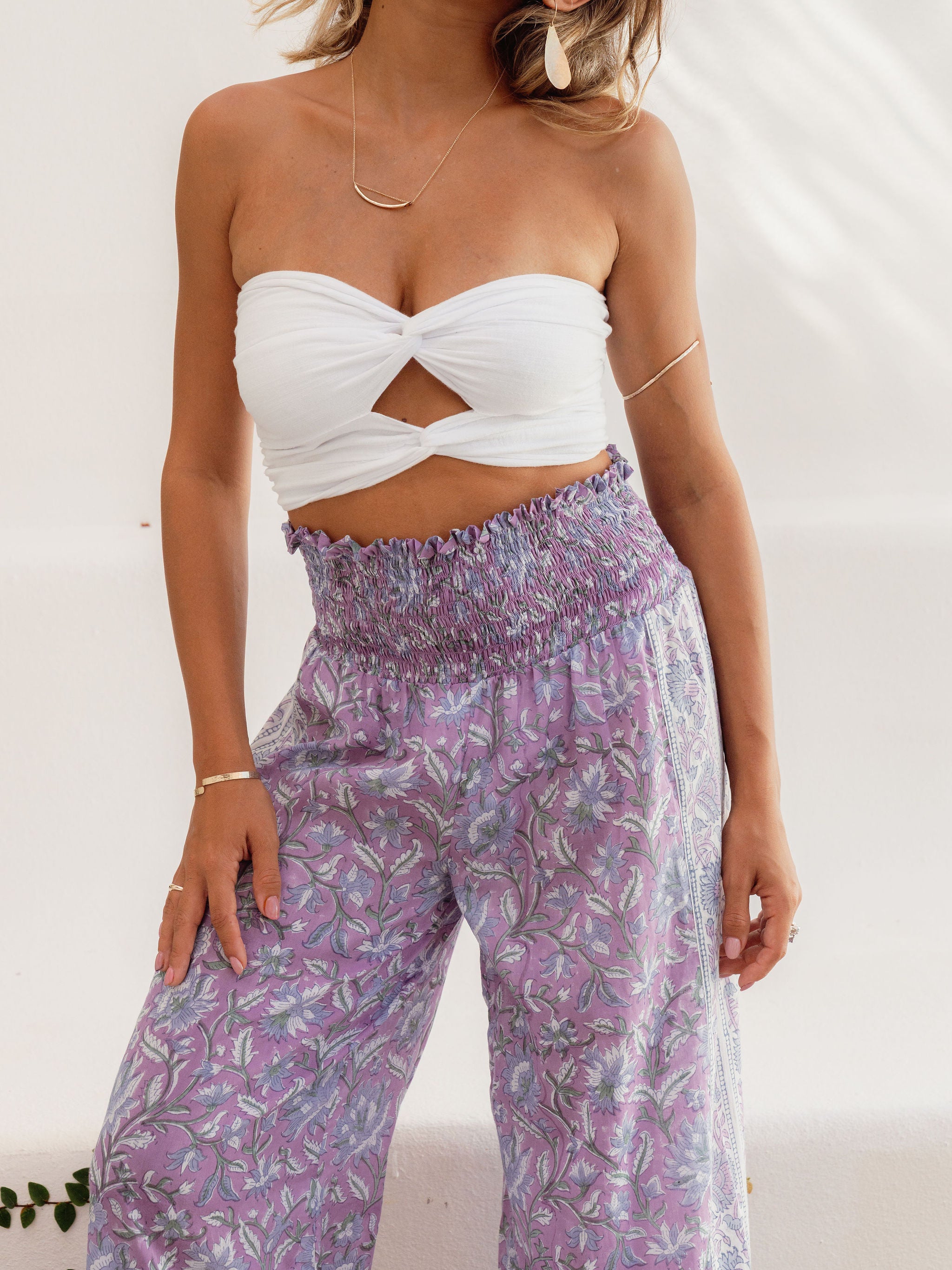 Float through your day in these dreamy, wide-leg pants made from airy-light 100% cotton voile. Hand block-printed by skilled artisans in Jaipur India, each pair is a wearable piece of art. The high smocked waistband hugs comfortably at the waist, while the flowy silhouette adds a relaxed, free-spirited vibe. Perfect for beach strolls, market mornings, or just embracing that barefoot-bohemian feeling—wherever you are.