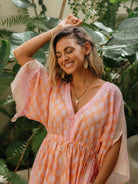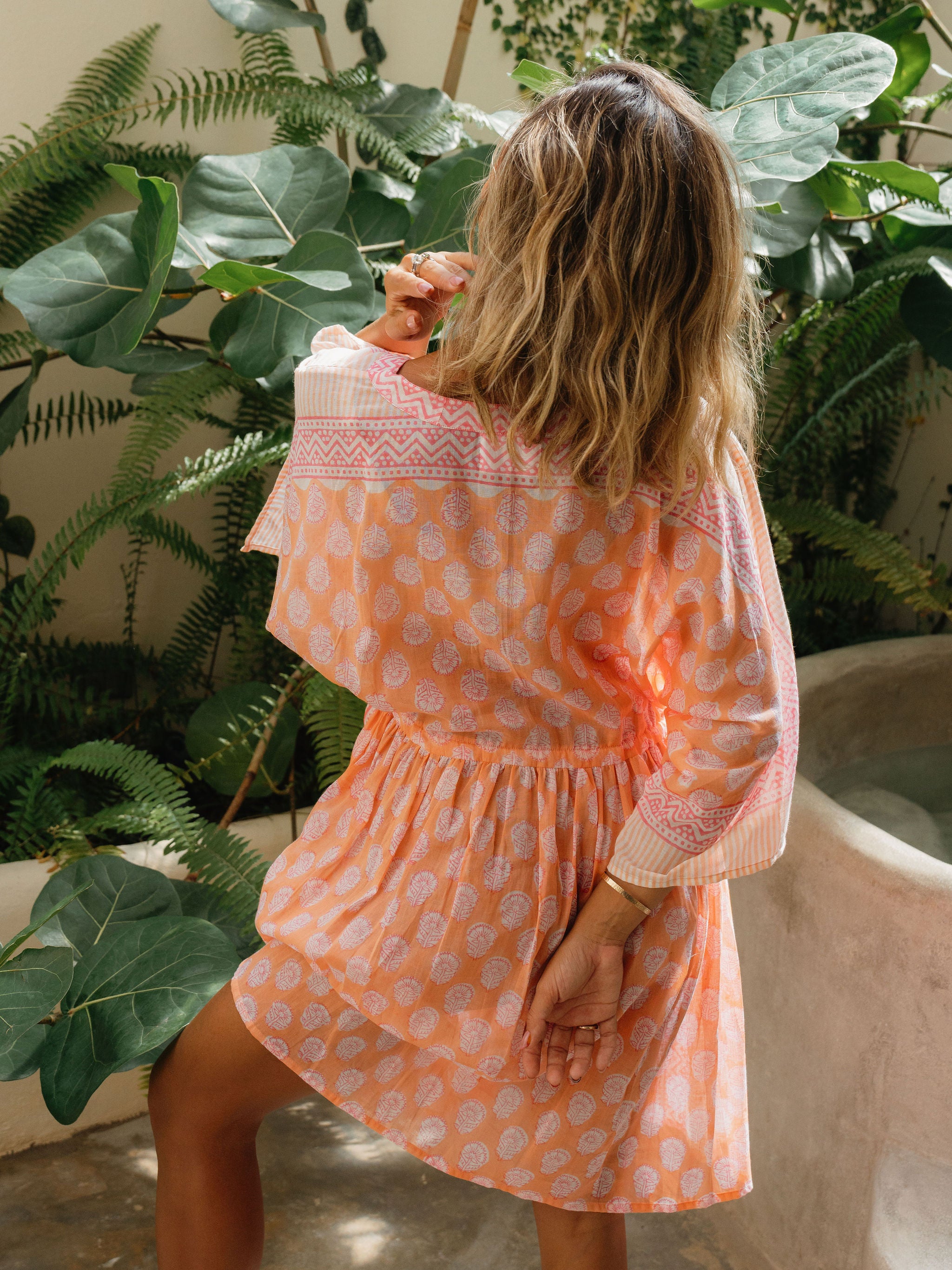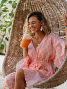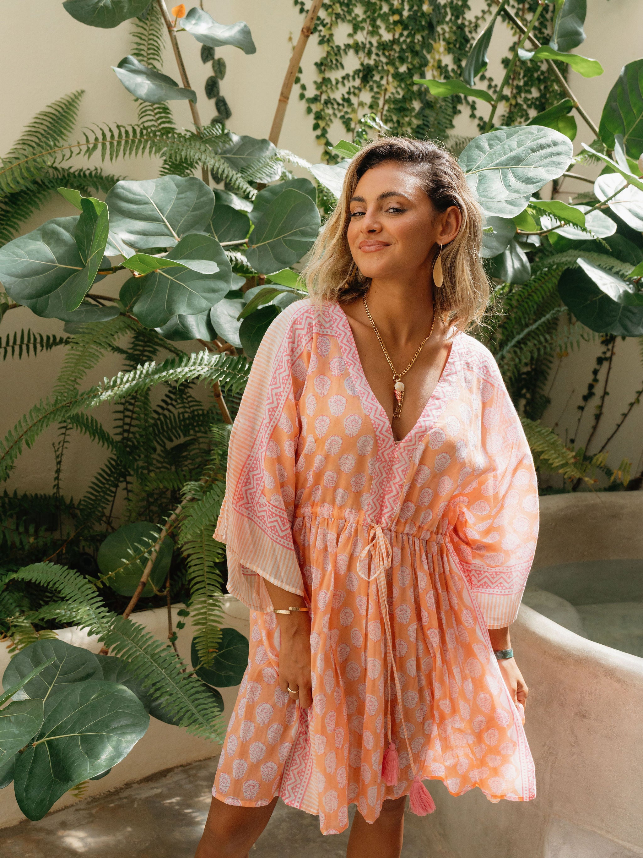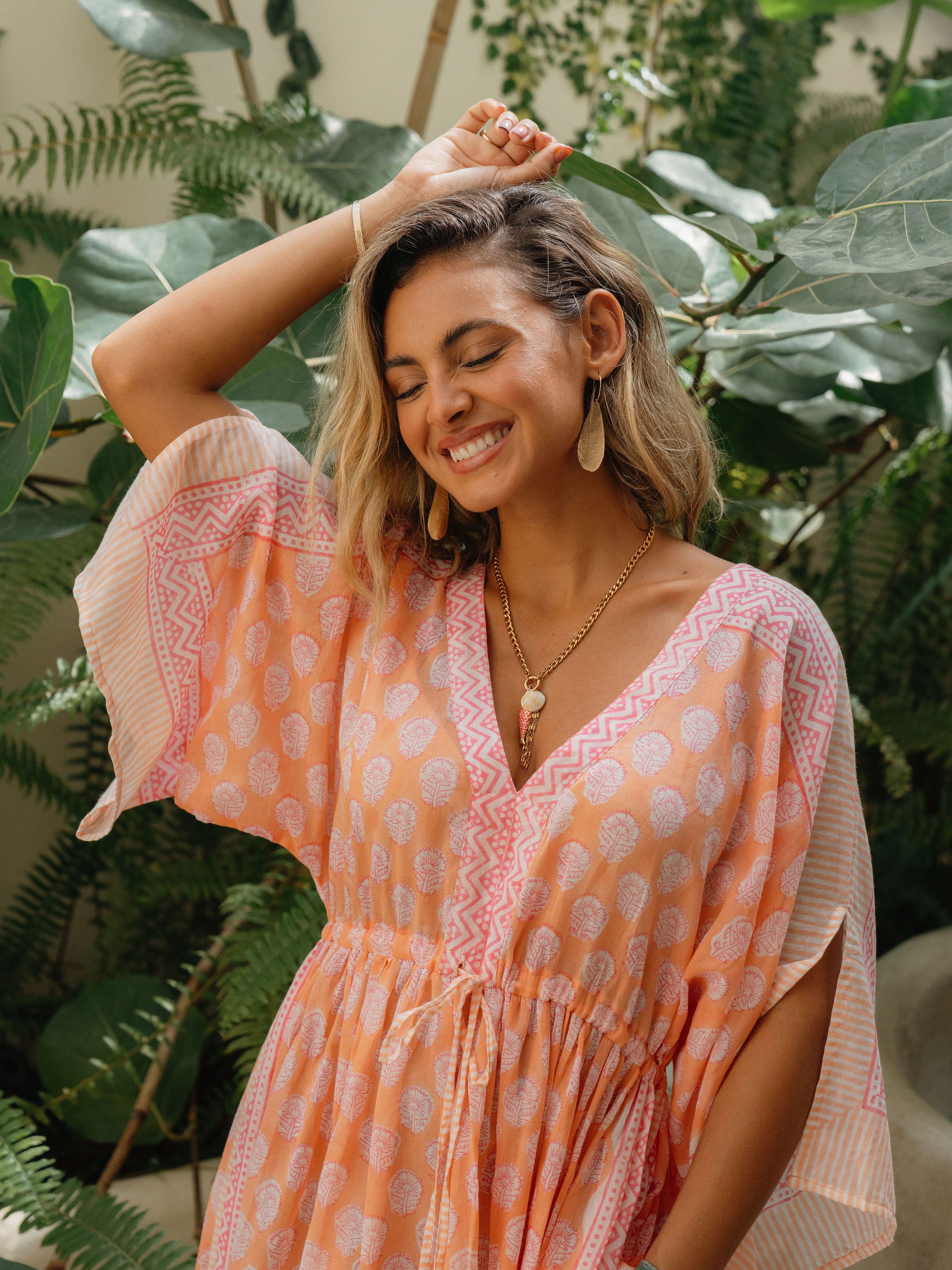The Isla Kaftan is your effortlessly chic beach-to-dinner staple. Crafted from lightweight, breathable 100% cotton voile, this one-size silhouette floats gracefully over the body, cinching gently at the waist for a flattering, custom fit. The fabric is hand block printed by artisans in Jaipur, India using ancient techniques. Made in small, batches, each piece carries the charm of slow fashion — no two are exactly alike. Wherever the tide takes you, Isla moves with you.