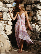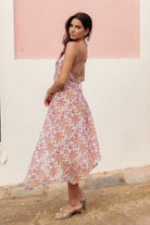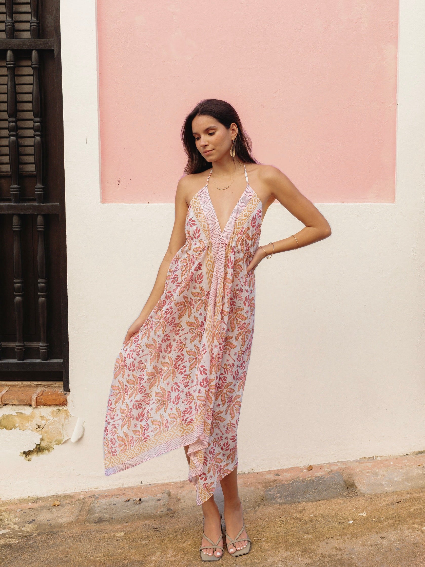 Hand block printed on airy-light 100% cotton voile. This flowy halter dress ties at the neck and under the bust for a fit that’s all your own. One size, made to move freely and flatter many forms.