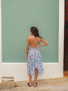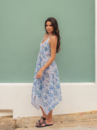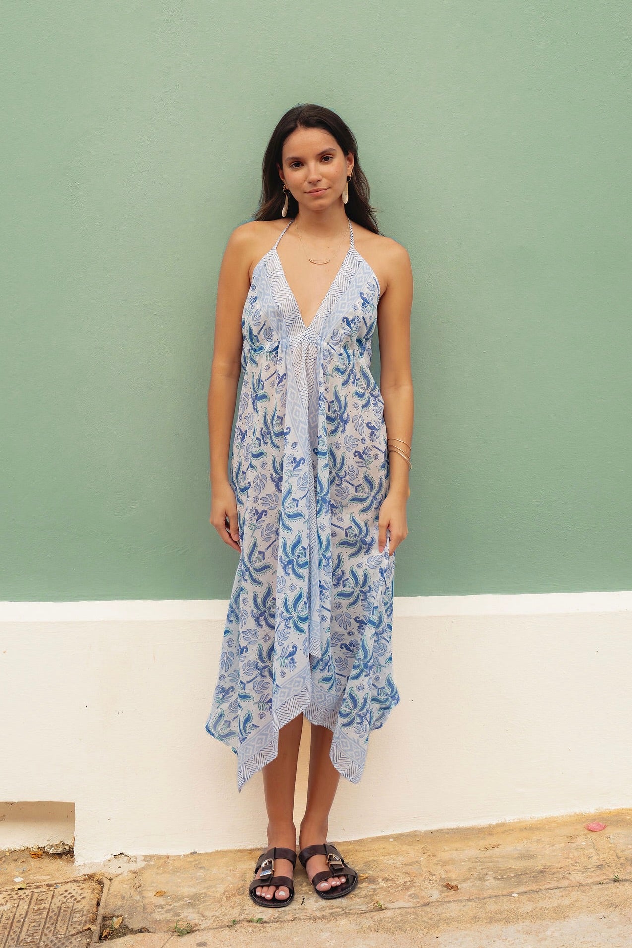 Hand block printed on airy-light 100% cotton voile. This flowy halter dress ties at the neck and under the bust for a fit that’s all your own. One size, made to move freely and flatter many forms.